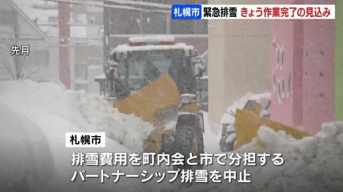 このため、札幌市は、排雪にかかる費用を町内会と市で分担する従来の「パートナーシップ排雪」を取りやめ、市内の生活道路約3800キロを対象に、札幌市が費用を全額負担する緊急排雪を実施しました。