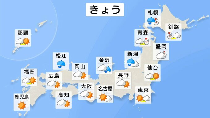 きょうは日本海から接近する低気圧の影響により、北日本や北陸を中心に荒れた天気となるでしょう。風が強まり、吹雪くところもありそうです。また、山陰でも夜まで雨や雪が続くでしょう。