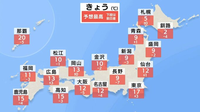 長野: 9℃ 金沢:10℃ 東京:17℃