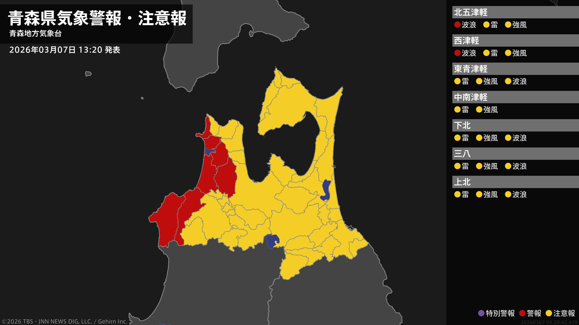 気象台は、午後1時20分に、波浪警報を五所川原市、つがる市、鰺ヶ沢町、深浦町、中泊町に発表しました。