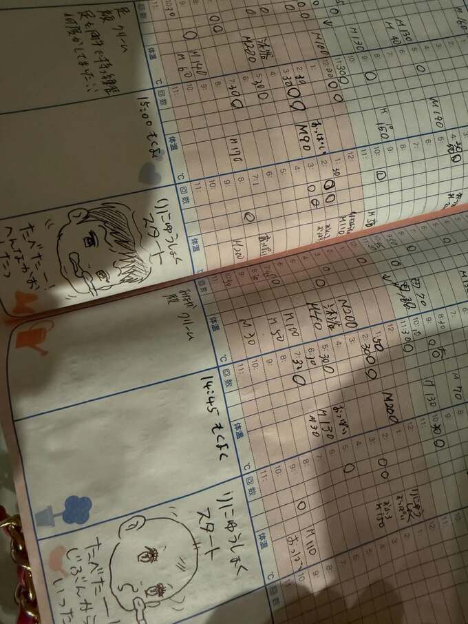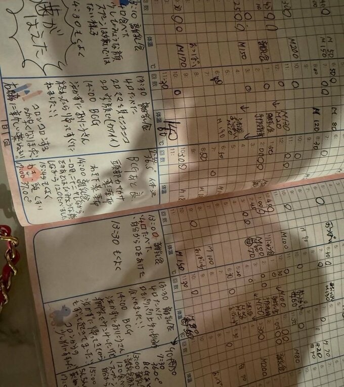 翔子さんは「いろんな人に助けてもらいながらみんなで双子をかわいがり育ててます」「我が家は手書き派!」と伝えていて、この育児ノートも良く見れば、複数の方々の筆跡が見て取れます。そのときそのとき、担当した人や気がついた人が書き込んでいて、皆で協力しながら双子を育てている様子が伝わってきます。