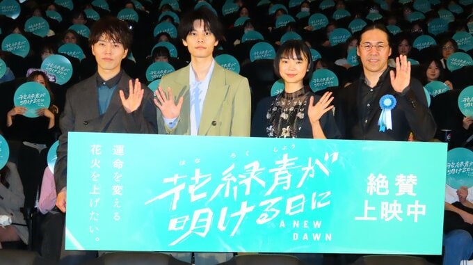 俳優の萩原利久さん、古川琴音さん、声優の入野自由さん、四宮義俊監督が映画『花緑青が明ける日に』の公開記念舞台挨拶に登場しました。