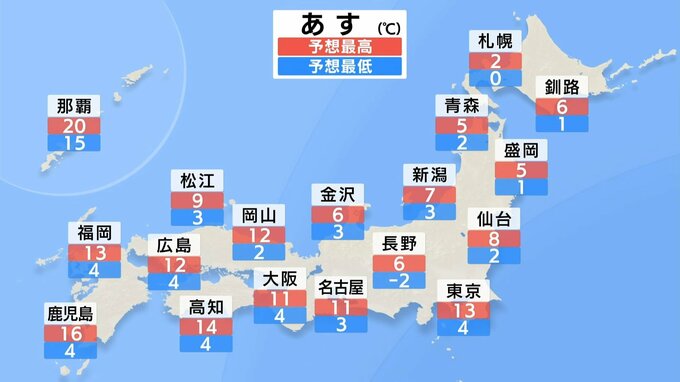 あすの気温です。寒気の影響で全国的にきょうより低くなる見込みです。特に北陸は最高気温で6℃程度と、冬のような寒さが戻るでしょう。東京の最高気温はきょうより4℃低い13℃で北風もやや強いため、厚手の上着があると良さそうです。
