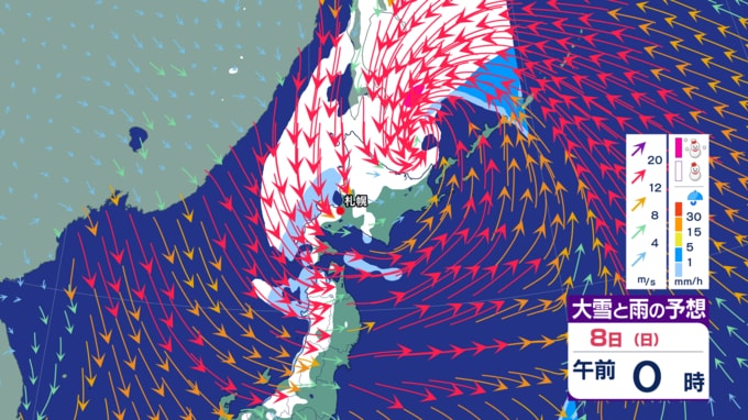 【北海道】7日夜から猛ふぶきに警戒 日本海側北部で50センチの大雪予想も 交通障害に注意必要 北海道放送 2026年3月7日(土) 18:20 国内 7日から8日までの雪の予想 ◆大雪と雨の予想シミュレーション(7日)(8日)(9日) 【雪の予想】 7日午後6時から8日午後6時までに予想される24時間降雪量は多い所で、 日本海側北部 50センチ 日本海側南部 30センチ オホーツク海側北部 40センチ