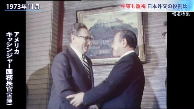 そして、イスラエルを支援していたアメリカのキッシンジャー国務長官が来日する。迎えたのは田中角栄総理だった。