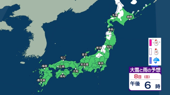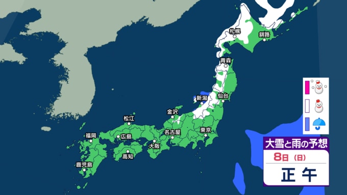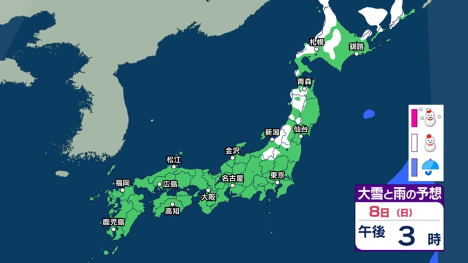 【今後の雨と雪は?】きょう8日は冬型の気圧配置が続き日本海側で雪の所も 10日ごろも広い範囲で雨や雪 北日本や北陸で大雪の可能性も【3時間ごとの雨雪シミュレーション・8日正午更新】