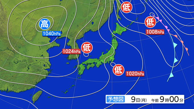 あす(9日)は、低気圧が伊豆諸島付近で発生して東北東へ進み、低気圧からのびる気圧の谷の影響を受ける見込みです。このため、曇り昼過ぎ晴れで、夜は雨や雪の降る所があるということです。