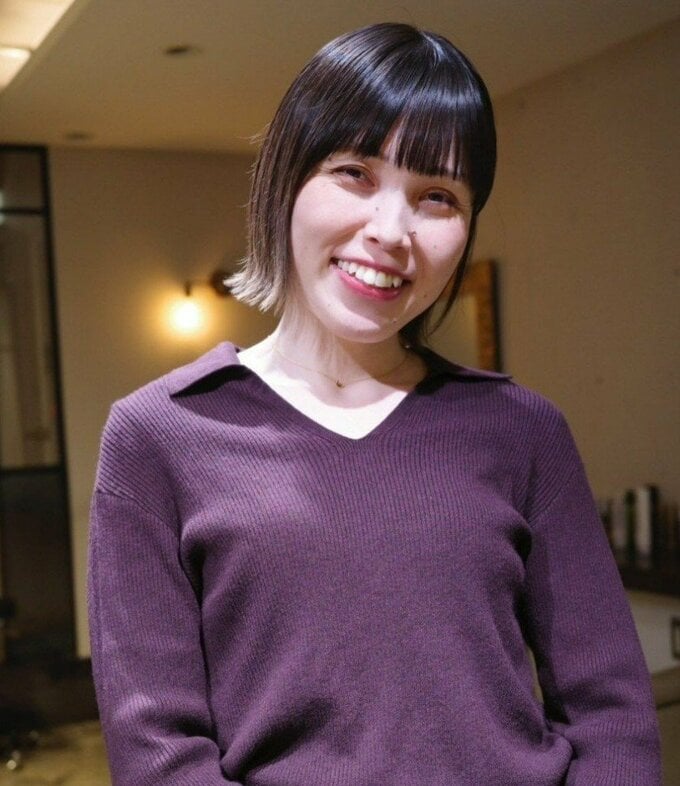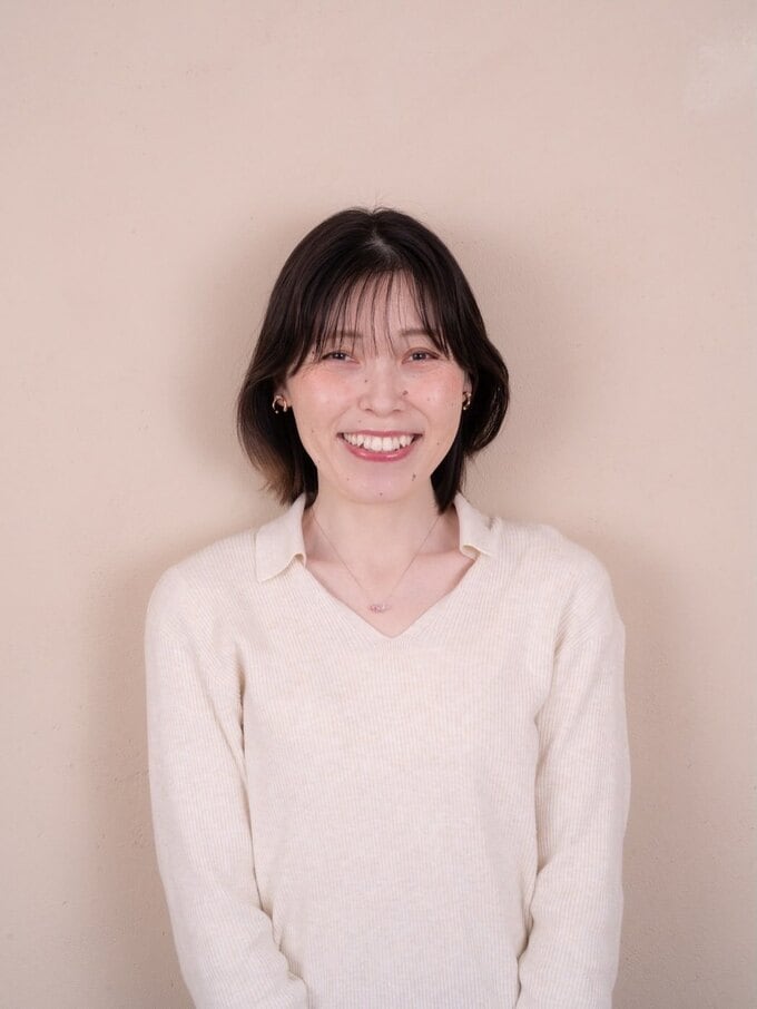 別の写真では、温かみのあるベージュの壁を背景に、クリーム色のセーターを着た誠子さんの姿が印象的です。ショートボブの髪型が顔立ちを美しく引き立て、穏やかな笑顔で柔らかな雰囲気を演出しています。日中の室内撮影らしく、全体が温かいベージュ系の色調でまとまった上品な仕上がりとなっています。