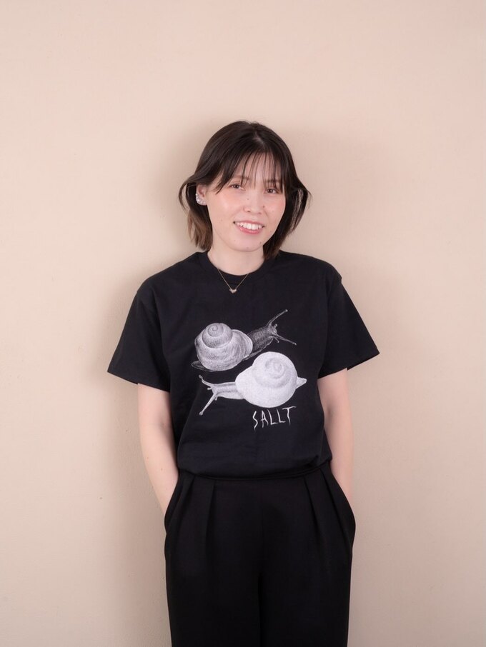 カジュアルなスタイルでは、白と灰色の二匹のかたつむりが描かれたユニークなデザインの黒いTシャツが目を引きます。このTシャツを黒いパンツと合わせ、ポケットに手を入れた自然な姿勢でカメラに微笑みかけています。シンプルながらも個性的なコーディネートを完成させています。