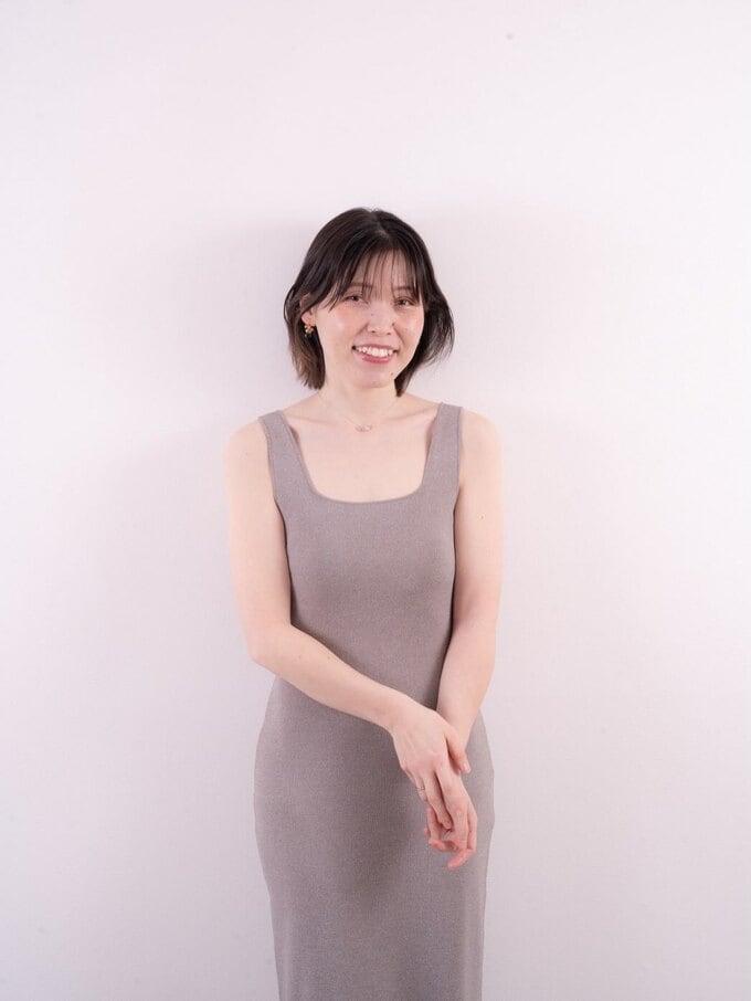 投稿された画像では、ピアスとネックレスを身に着けた誠子さんが淡いピンクの壁を背景に、体のラインに沿う細身のグレーのノースリーブワンピースを着用。両手を前で組んだ自然な姿勢で、穏やかな微笑みを浮かべています。肩にかかるボブカットが自然な表情を際立たせ、ドレスのグレーと背景の明るいトーンの対比が落ち着いた雰囲気を醸し出しています。