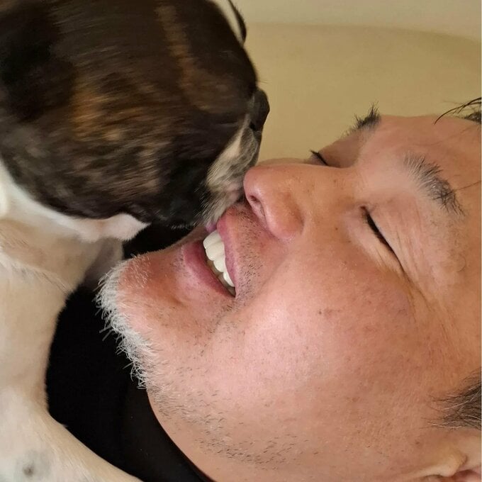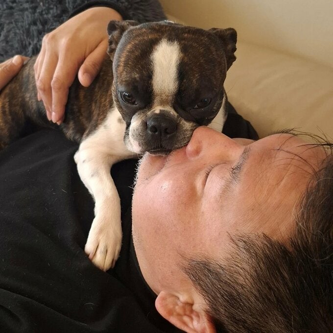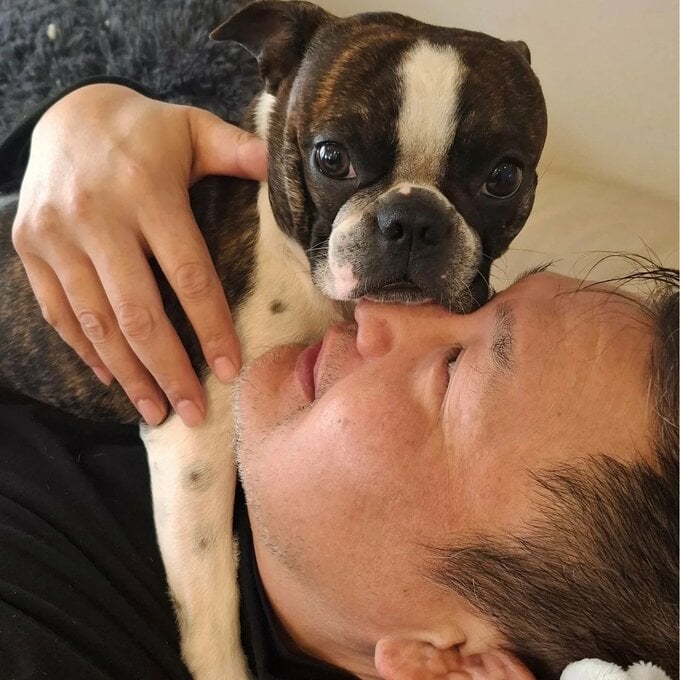 投稿された写真では、室内で横になる貴乃花さんの胸元に、白と黒のコントラストが美しいボストンテリアが寄り添っています。犬は前脚を貴乃花さんの胸に置き、鼻を顔に近づけて甘える様子を見せています。貴乃花さんは目を閉じてリラックスした表情を浮かべており、愛犬との穏やかな時間を過ごしている様子が伝わってきます。