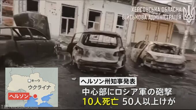 ロシアがウクライナ侵攻を始めてから10か月となった24日、ウクライナが先月奪還した南部ヘルソンにロシア軍の砲撃があり、10人が死亡しました。黒く焼け焦げた車。ウクライナのヘルソン州当局が公開した映像です。…