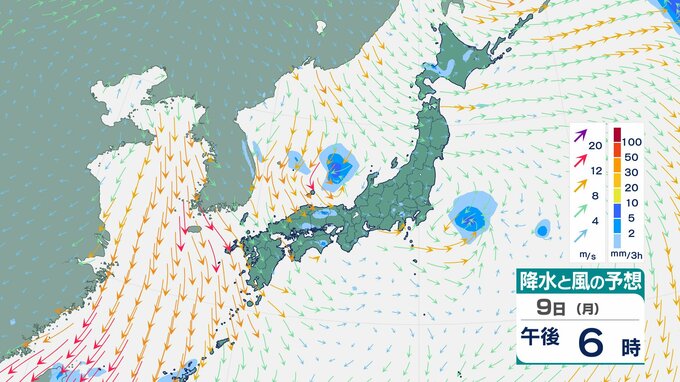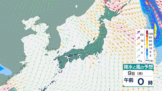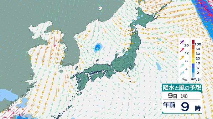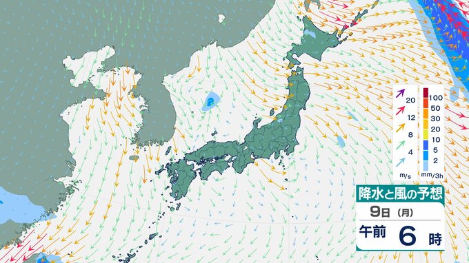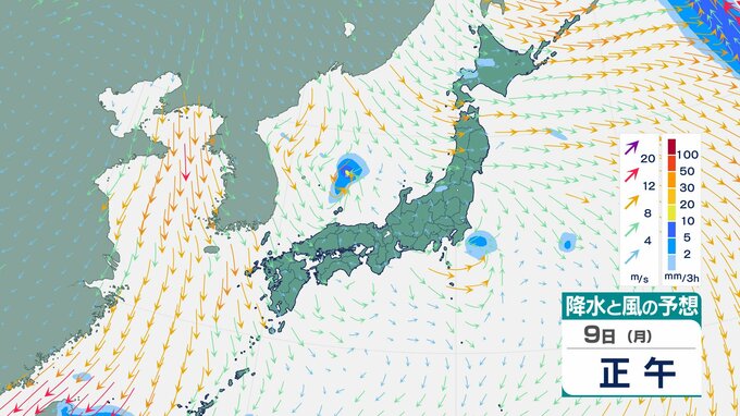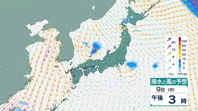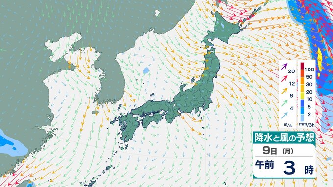 「真冬の嵐」再来か 北日本で3時間5cm降雪 9日から東・西日本も「落雷・ひょう」おそれ【雨と風のシミュレーション】 チューリップテレビ 2026年3月8日(日) 18:37 国内 9日(月)の雨と風のシミュレーション