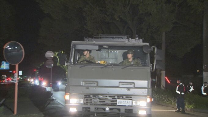そして、午前0時15分ごろ、反撃能力がある長射程ミサイル「12式地対艦誘導弾能力向上型」の発射機と見られる車両が、正門ではない入り口に姿を見せました。
