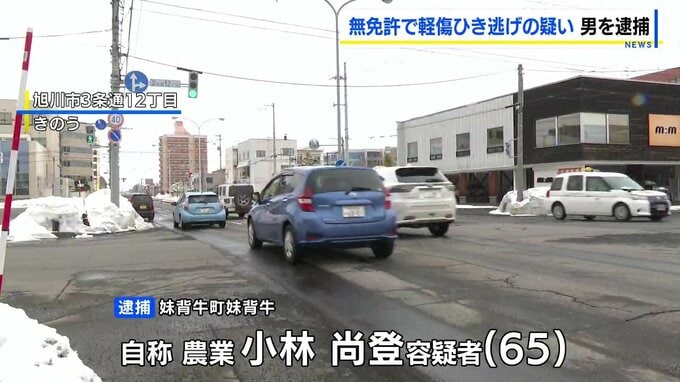 北海道妹背牛町の自称・農業、小林尚登容疑者は、7日午後4時ごろ、旭川市3条通12丁目の信号交差点で、無免許で軽乗用車を運転し、左から来た別の軽乗用車と衝突。