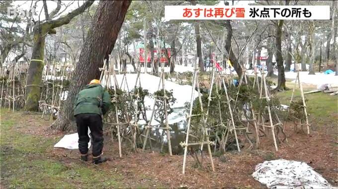 【冬囲いの撤去作業をする人】「天候にも恵まれて順調に囲い外しができています。観桜会までにはきれいに園内を掃除しなくてはいけないし。なかなかハードですけど、間に合うように一生懸命やっています」