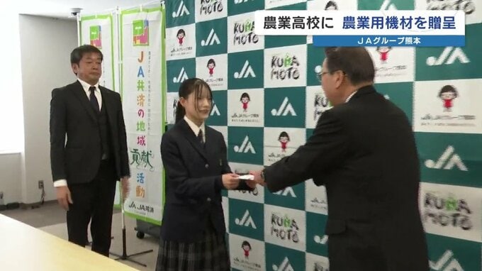 熊本県内7つの農業高校に、JAグループ熊本から農薬散布機や耕うん機など農業用機材12点が贈られました。 (北稜/鹿本農業/翔陽/八代農業/芦北/南稜/天草拓心)これはJAグループ熊本が、農業高校の生徒に技…