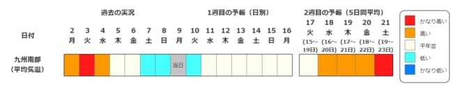九州南部の気温は、向こう1週間程度は平年並の日が多いですが、その後は暖かい空気が流れ込みやすいため高く、19日頃からはかなり高くなる可能性があります。農作物の管理等に注意してください。また、今後の気象情報等に留意してください。