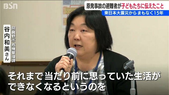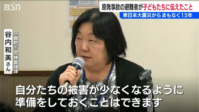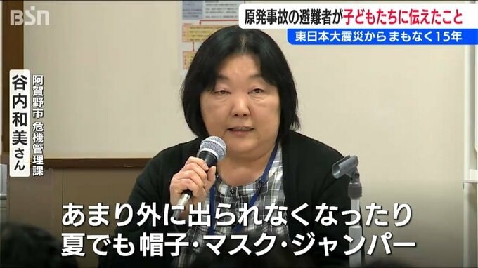 【阿賀野市 危機管理課 谷内和美さん】「福島第一原子原子力発電所の事故が起こり、その影響で水道の水が飲めなかったり、あまり外に出られなくなったり、夏でも帽子、マスク、ジャンパー、長ズボン、長靴で学校に行ったりという生活になりました」