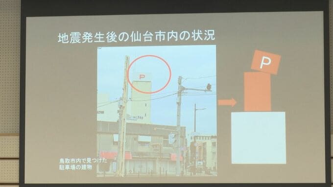 駐車場の建物の「P」の文字が揺れで落ちそうになっている。