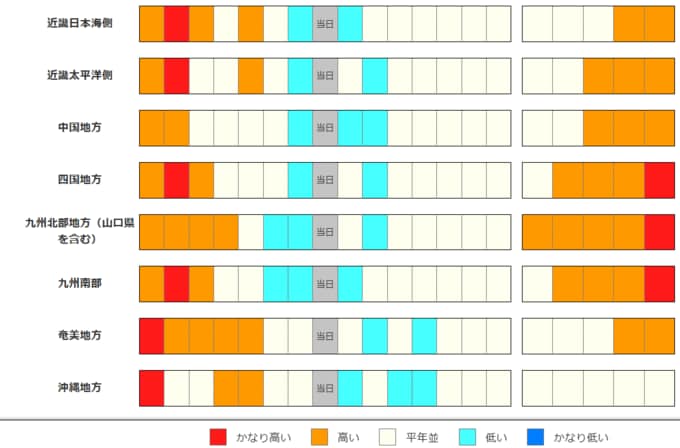 東北地方と東・西日本の気温は、13日頃までは平年並か低いでしょう。その後は暖かい空気に覆われやすいため平年並か高く、四国地方、九州北部地方と九州南部では19日頃からはかなり高くなる可能性があります。農作物の管理等に注意してください。