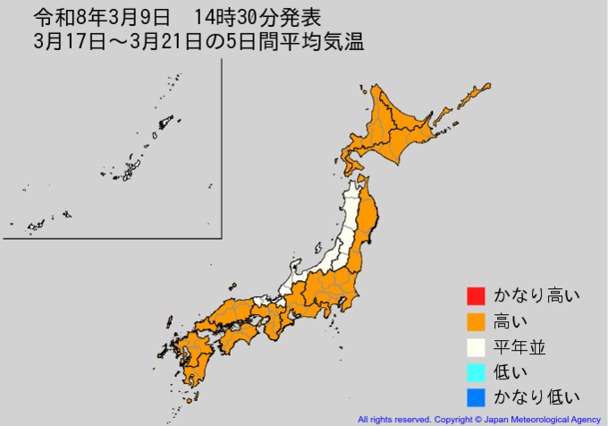 【2週間気温予報】東北地方と東・西日本の気温は13日頃までは平年並か低い予報 その後は平年並か高い予報 農作物の管理などに注意 全国の天気を地方ごとに 気象庁 テレビユー山形 2026年3月9日(月) 20:17 国内 ■3月17日~3月21日の5日間平均気温(画像) ・8日先から12日先まで5日間平均した日平均気温を表示しています。 ・かなり高い(かなり低い)は、かなり高い(かなり低い)気温となる確率が30%以上のときに表示します。