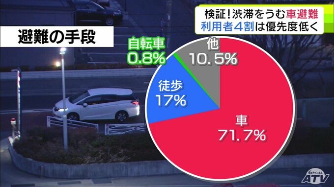 実際に避難した人のうち「徒歩」は17%に対して、「車を使った」のは71.7%にのぼりました。さらに、このうち半数ほどが渋滞に遭遇していました。