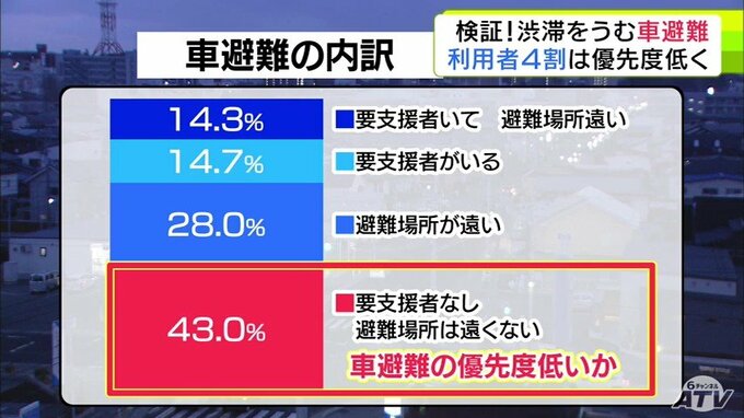 避難行動要支援者がいるうえ、避難場所も遠く、車を使わないと間に合わないと回答した人は14.3%。これに対して、要支援者はおらず避難場所も遠くはないとした人、つまり車避難の優先度が低いと見られる人は43%にのぼりました。