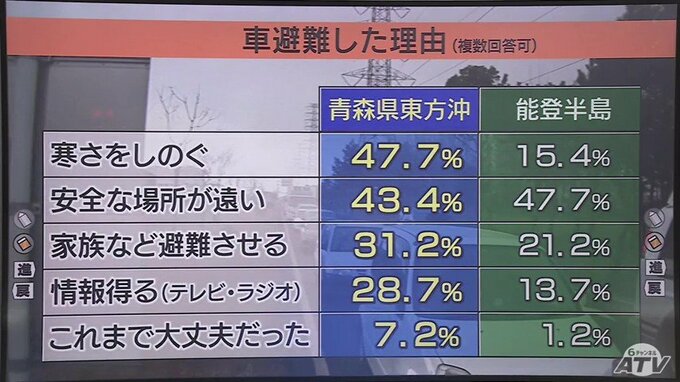 最も大きかったのは「寒さをしのぐ」で47.7%、2024年の能登半島地震の15.4%と比べていかに大きいかわかります。次いで「安全な場所が遠い」、「家族などを避難させるため」などが続きました。