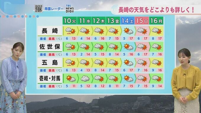 9日(月)は、長崎県を山で雪になる目安の寒気がすっぽりと覆っています。この寒気が抜けるのは14日(土)になりそうで、13日(金)頃までは空気の冷たさが続く見込みです。