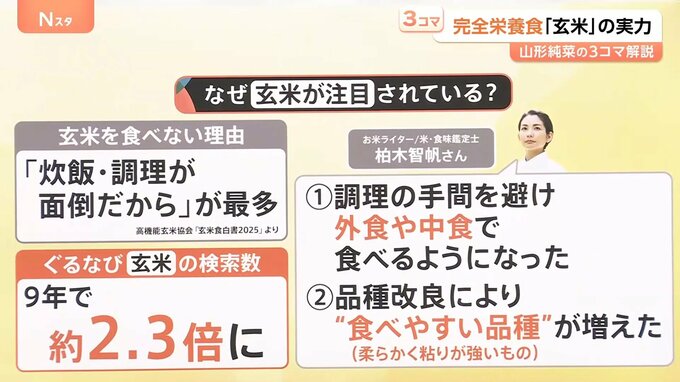 高機能玄米協会「玄米食白書2025」によると、玄米を食べない理由として最も多いのが、「炊飯・調理が面倒だから」でした。ただ、「ぐるなび」での「玄米」の検索数は9年で約2.3倍に伸びているんです。