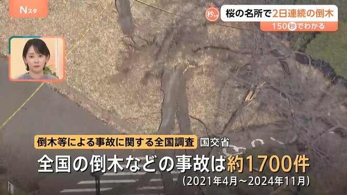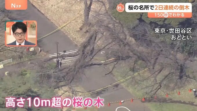 7日、公園内の道路には、高さ10mを超える桜の木が横たわっていました。ソメイヨシノの木が倒れ、70代の女性が下敷きになり、けがをしたということです。