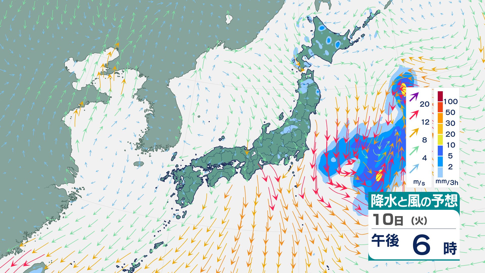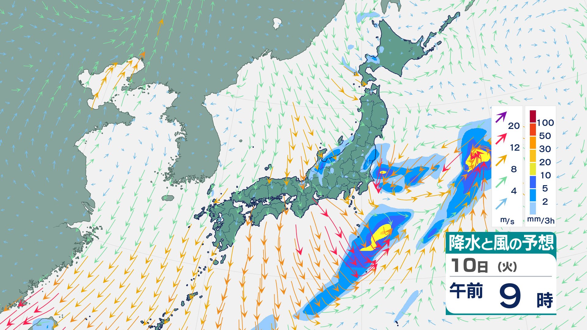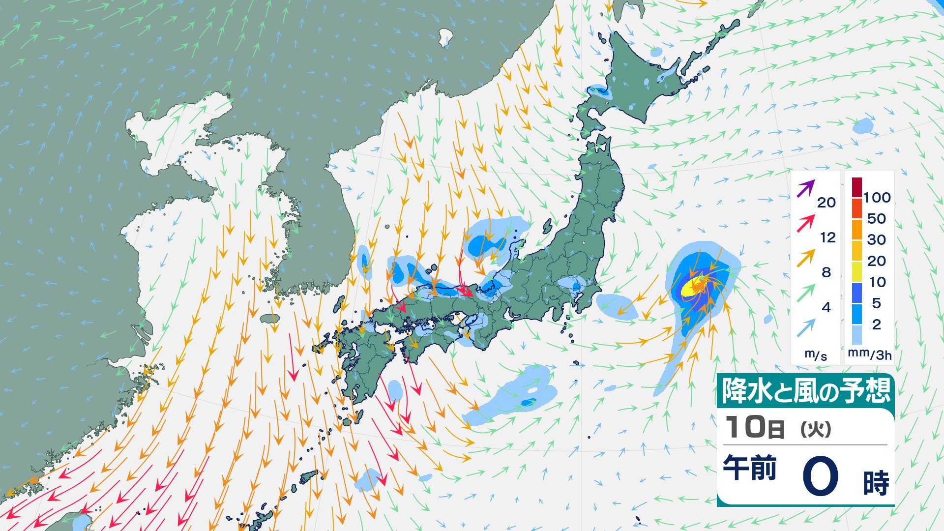 四国・九州北部・九州南部は“真っ赤”…“10年に一度レベル”の高温の可能性 19日ごろから 気象庁が「早期天候情報」発表 チューリップテレビ 2026年3月9日(月) 20:28 10日(火)の雨と風のシミュレーション