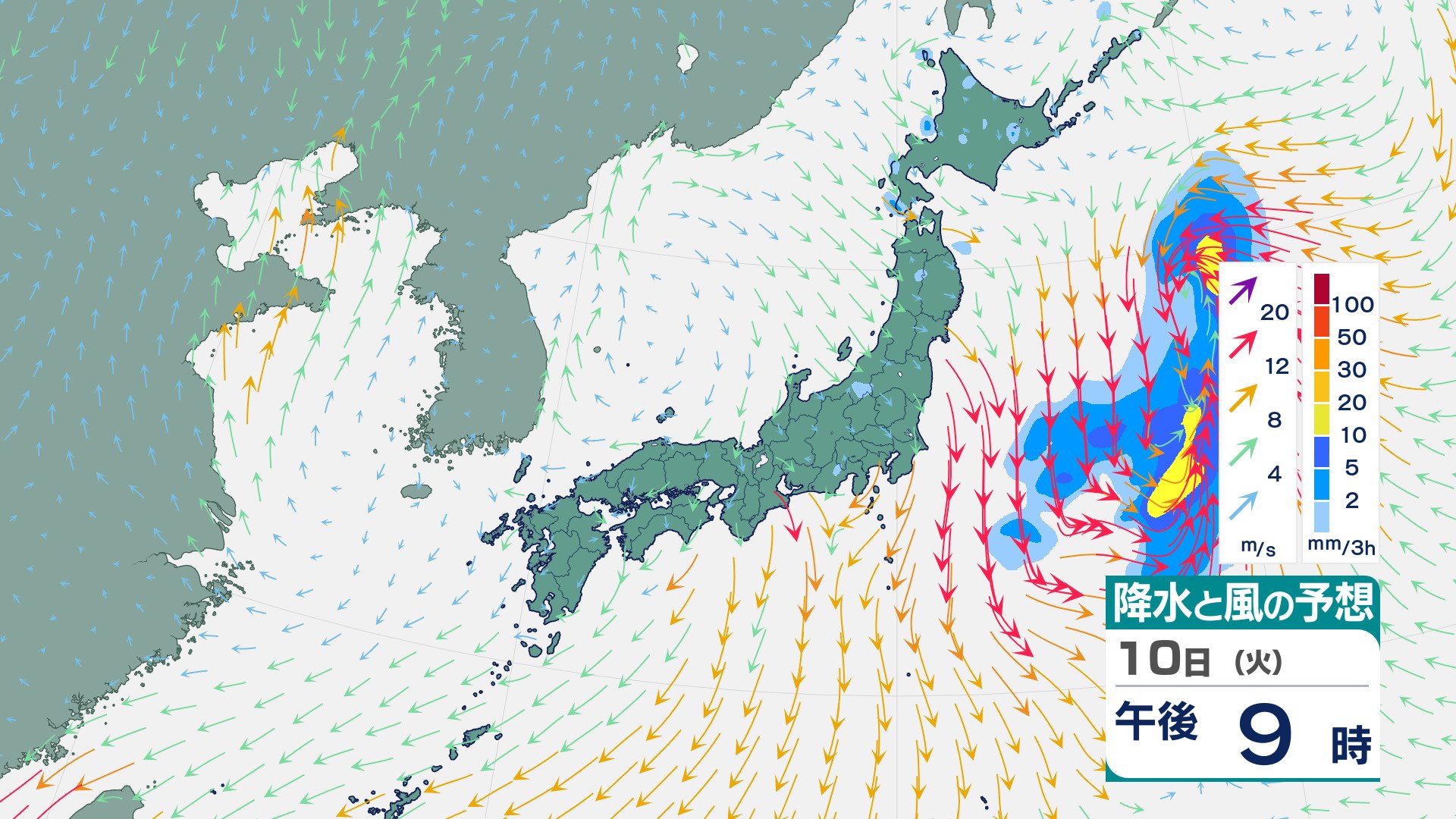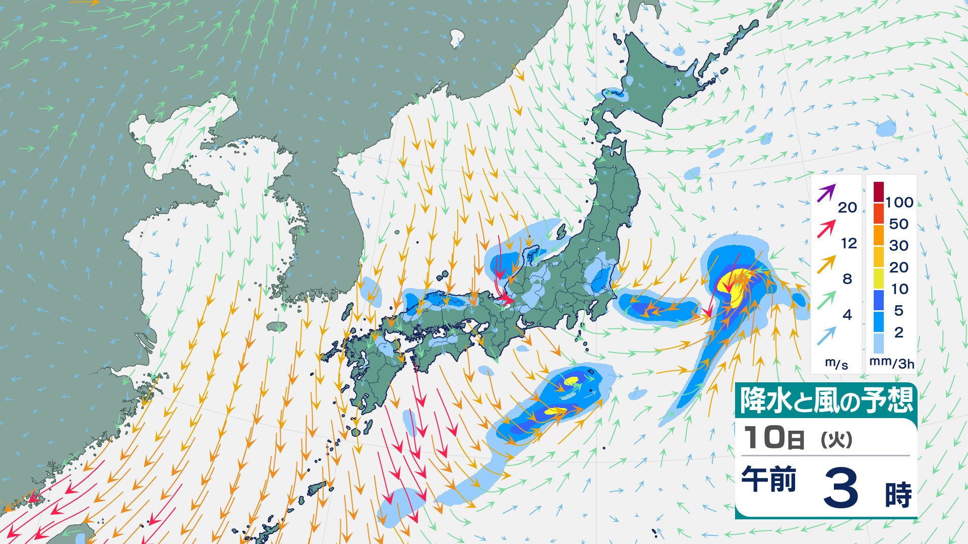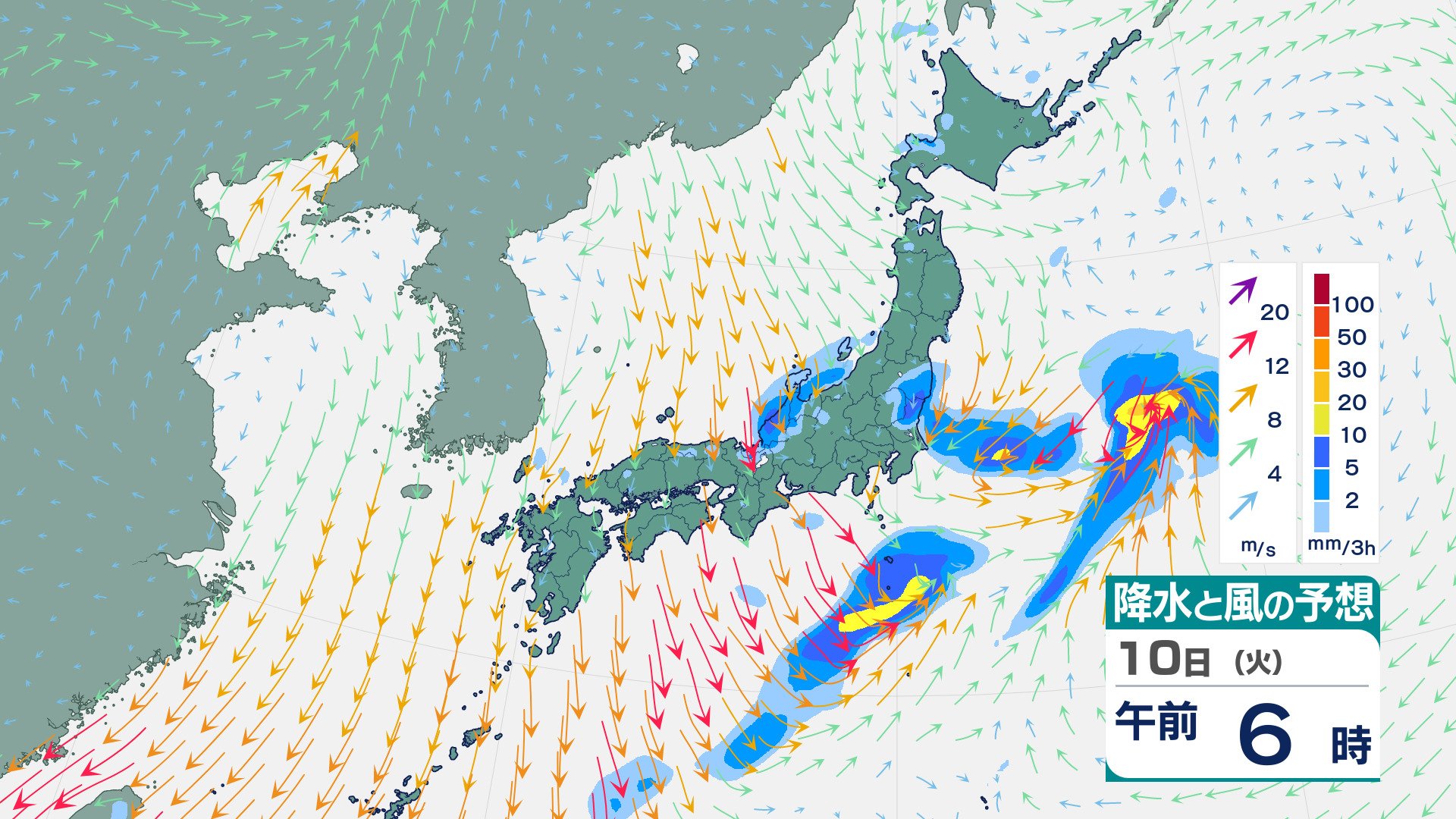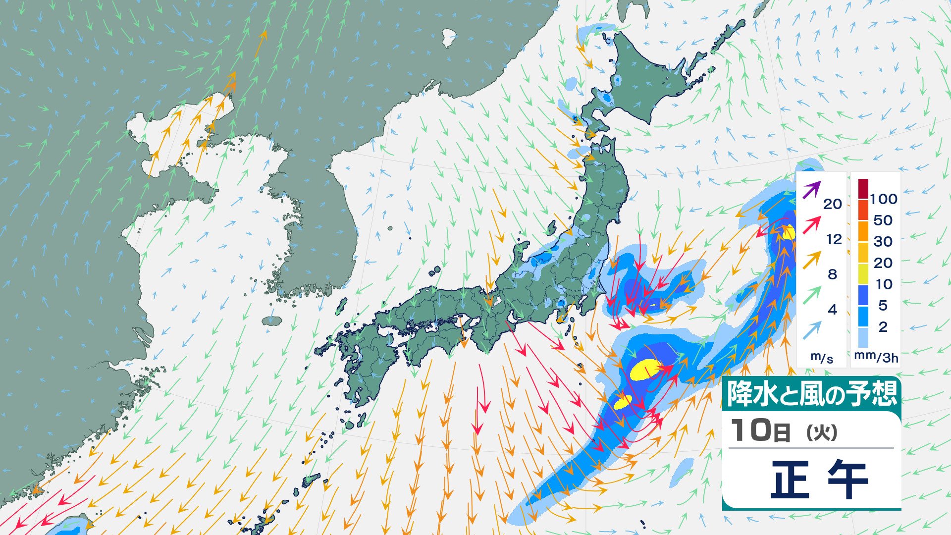四国・九州北部・九州南部は“真っ赤”…“10年に一度レベル”の高温の可能性 19日ごろから 気象庁が「早期天候情報」発表 チューリップテレビ 2026年3月9日(月) 20:28 10日(火)の雨と風のシミュレーション