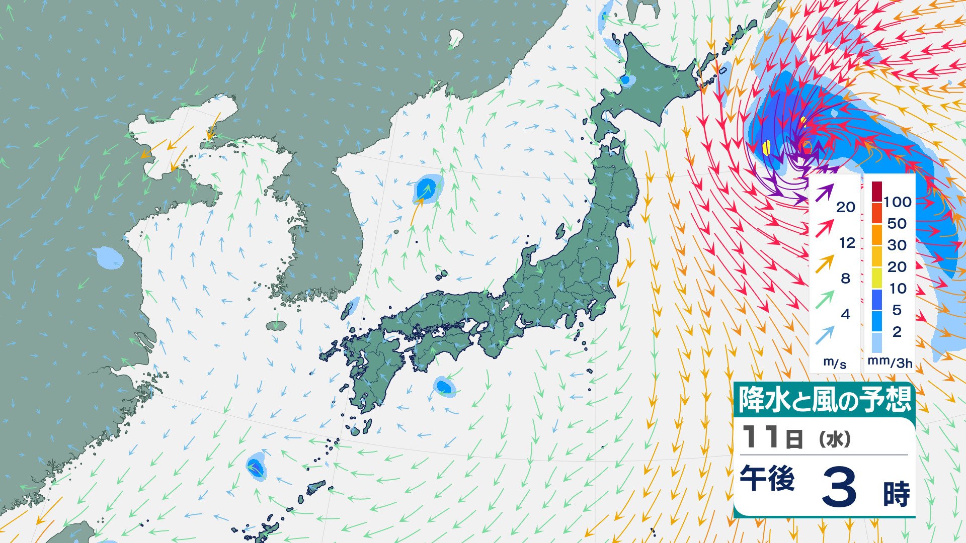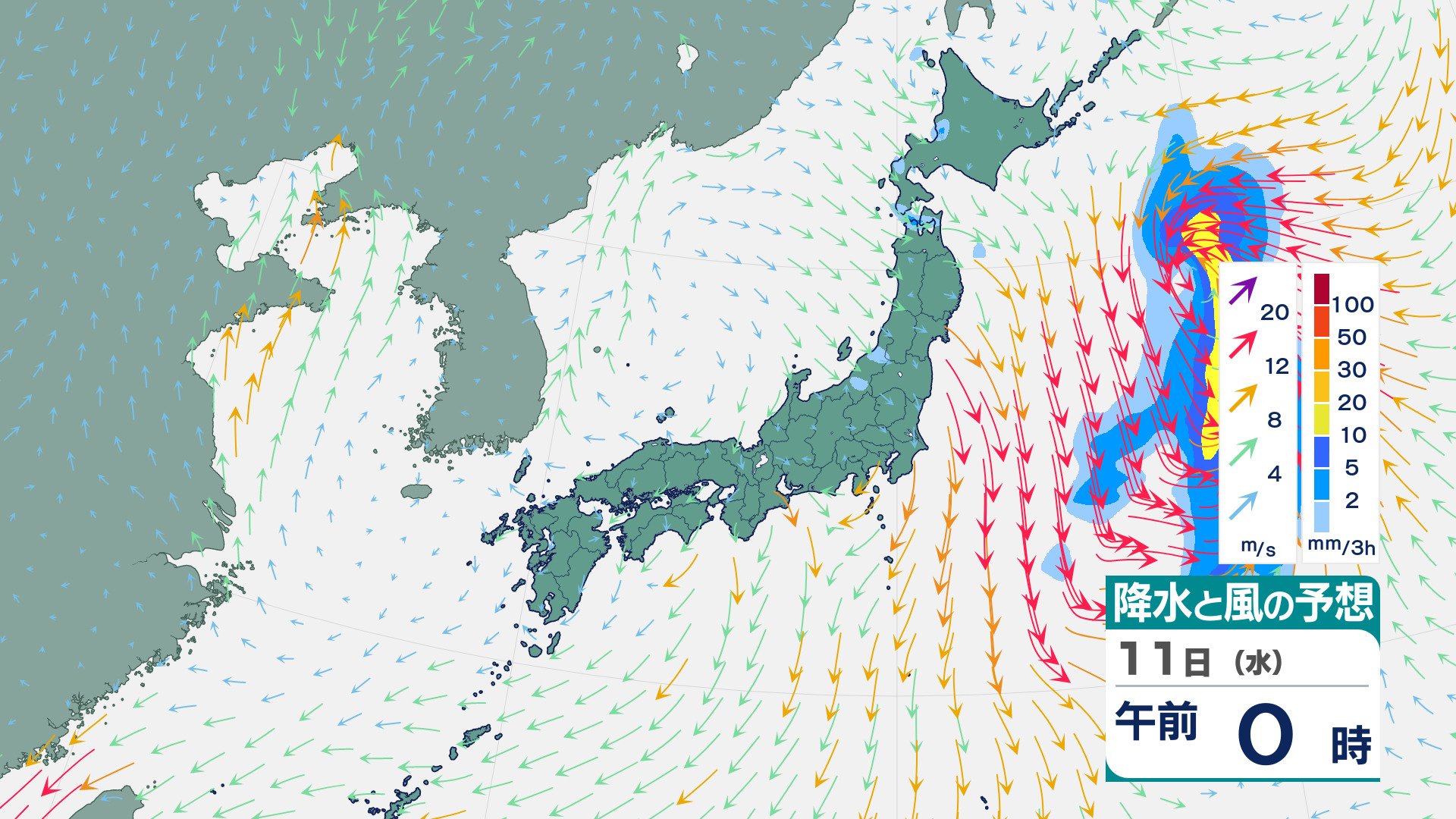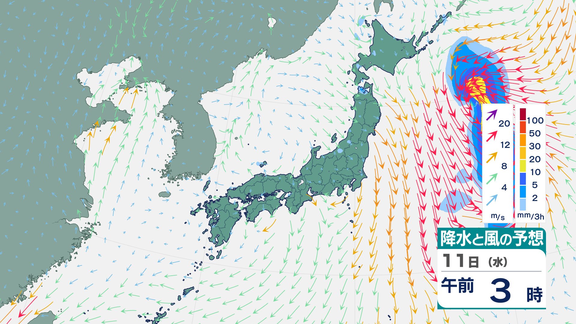 四国・九州北部・九州南部は“真っ赤”…“10年に一度レベル”の高温の可能性 19日ごろから 気象庁が「早期天候情報」発表 チューリップテレビ 2026年3月9日(月) 20:28 11日(水)の雨と風のシミュレーション