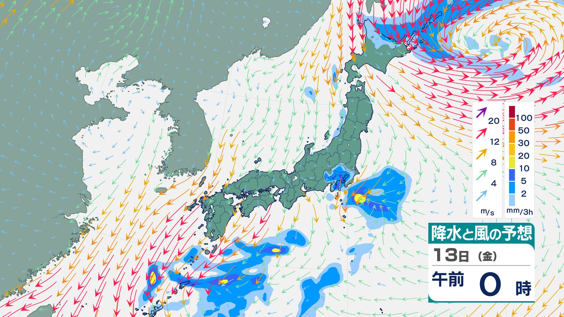 四国・九州北部・九州南部は“真っ赤”…“10年に一度レベル”の高温の可能性 19日ごろから 気象庁が「早期天候情報」発表 チューリップテレビ 2026年3月9日(月) 20:28 13日(金)の雨と風のシミュレーション