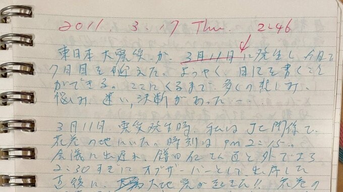 <東日本大震災が3月11日に発生し、きょうで7日目を迎えた。ようやく日記を書くことができる。ここにくるまで多くの悲しみ、悩み、迷い、決断があった…>