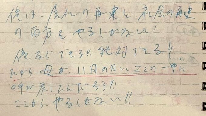 いくつもの重圧の中で、高橋さんは日記のページに自らを奮い立たせる言葉を書き連ねている。