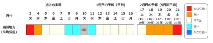 四国地方の気温は、向こう1週間程度は平年並の日が多いですが、その後は暖かい空気が流れ込みやすいため高く、19日頃からはかなり高くなる可能性があります。