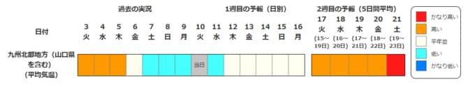 九州北部地方(山口県を含む)の気温は、向こう1週間程度は平年並の日