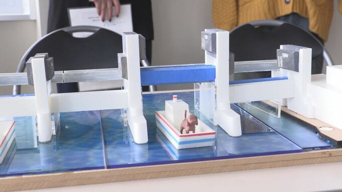 台風10号災害を受けて県が整備した岩泉町にある「小本川流木捕捉施設」と、震災復興事業で整備が進められている宮古市の「閉伊川水門」が精巧に再現されています。