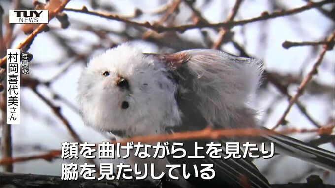 写真家 村岡喜代美さん「シマエナガの首をかしげるのは敵がいるかいないかを見るため。シマエナガは目が動かない。顔を曲げながら上を見たり脇を見たりしている。猛禽類がいれば自分が食べられますのでそれを警戒しているしぐさの1つだと思う」