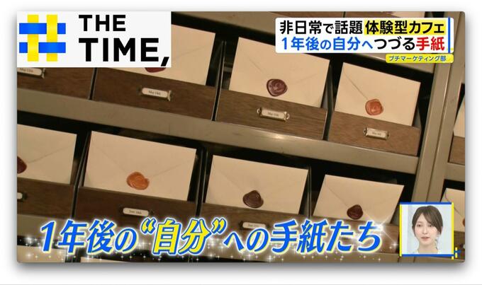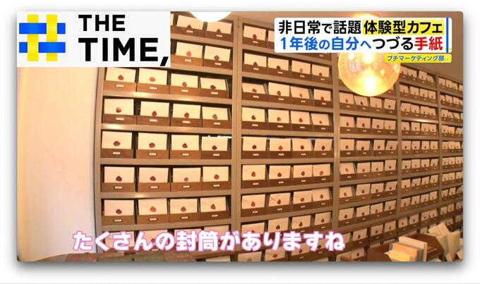1年後の自分宛てに手紙を書くことが出来るカフェ『封灯』(東京・台東区)。壁の手紙棚に並べられた封筒は、お客さんが書いた“自分への手紙”です。