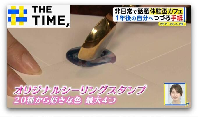 書き終えたら、20種から好きな色を最大で4つ選んで「ろう」を溶かし、オリジナルのシーリングスタンプを押して封印。