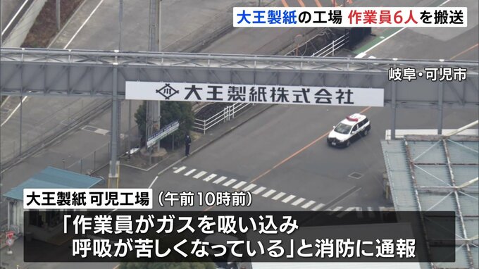 岐阜県可児市にある大王製紙の工場で、作業員6人がガスを吸い込み病院に搬送されました。このうち1人が意識不明の重体です。きょう午前10時前、岐阜県可児市の大王製紙可児工場で、「作業員がガスを吸い込み、呼吸…