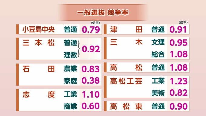 【速報】香川県公立高校一般選抜 競争率 高松1.08倍 高松南(普通)1.42倍【10日実施】 RSK山陽放送 2026年3月10日(火) 14:43 国内 小豆島中央・三本松・石田・志度・津田・三木・高松・高松工芸・高松東