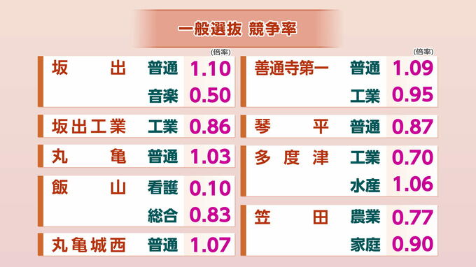 【速報】香川県公立高校一般選抜 競争率 高松1.08倍 高松南(普通)1.42倍【10日実施】 RSK山陽放送 2026年3月10日(火) 14:43 国内 坂出・坂出工業・丸亀・飯山・丸亀城西・善通寺第一・琴平・多度津・笠田