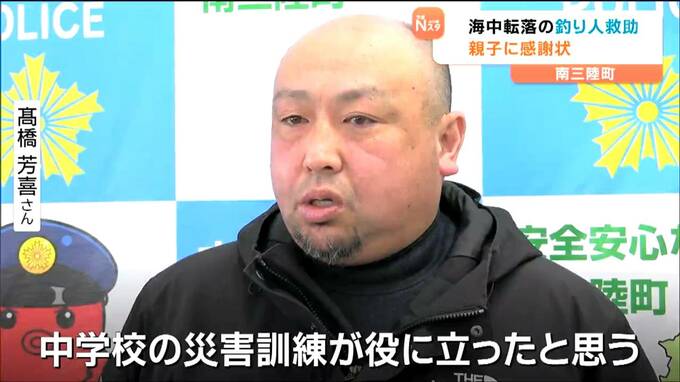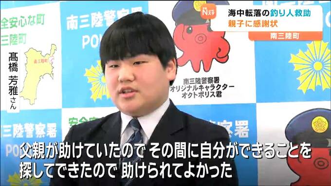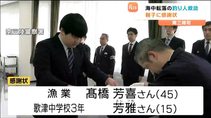宮城県南三陸町内で海中に転落した釣り人を救助したとして、10日に町内に住む親子に南三陸警察署から感謝状が贈られました。