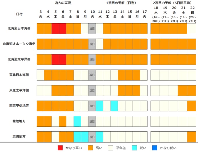 東北地方と東・西日本の気温は、13日頃までは平年並か低く、その後は平年並か高いでしょう。