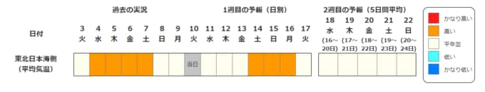 ・2週目の予報は中心の日に前後2日間を加えた5日間の平均(最高気温の5日間平均、最低気温の5日間平均、平均気温の5日間平均)です。平均期間を中心の日の下に表示しています。2週目のかなり高い(かなり低い)は、かなり高い(かなり低い)気温となる確率が30%以上のときに表示します。